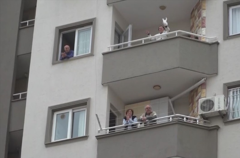 Gitar, bağlama ve darbuka eşliğinde zabıta ekiplerinin moral vermek için gerçekleştirdikleri kısa gösteriye, vatandaşlar da balkonlarından eşlik etti ve alkışla ritm tuttu.