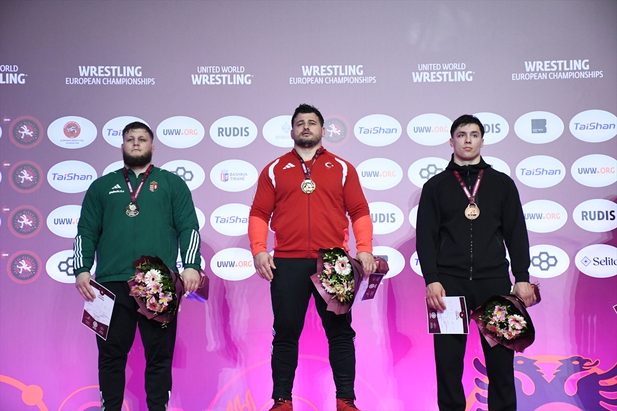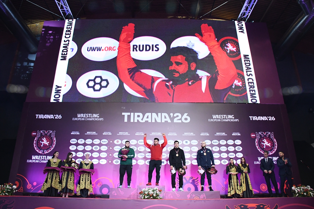 [1/17] Rıza Kayaalp, Arnavutluk'un başkenti Tiran'daki 2026 Avrupa Güreş Şampiyonası'nın ikinci gününde grekoromen stil 130 kilo finalinde Macar Darius Attila Vitek ile karşılaştı. Dünya ikincisi rakibini 7-1 yenen Milli güreşçi Kayaalp, 13'üncü Avrupa şampiyonluğuna ulaşarak güreş tarihine geçti. Kayalap, düzenlenen törenle madalyasını aldı.
